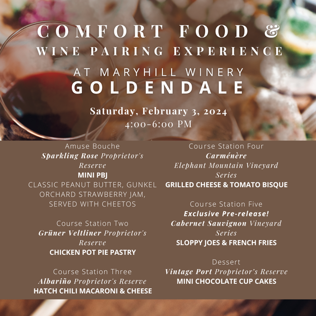 Join our Goldendale team for a six course stationed comfort food and wine pairing experience while we explore some classic comfort foods and their ideal Maryhill wine companions, creating a symphony of flavors that will leave you feeling content and satisfied. The wine pairings will include an exclusive pre-release wine currently unavailable to the public or members.