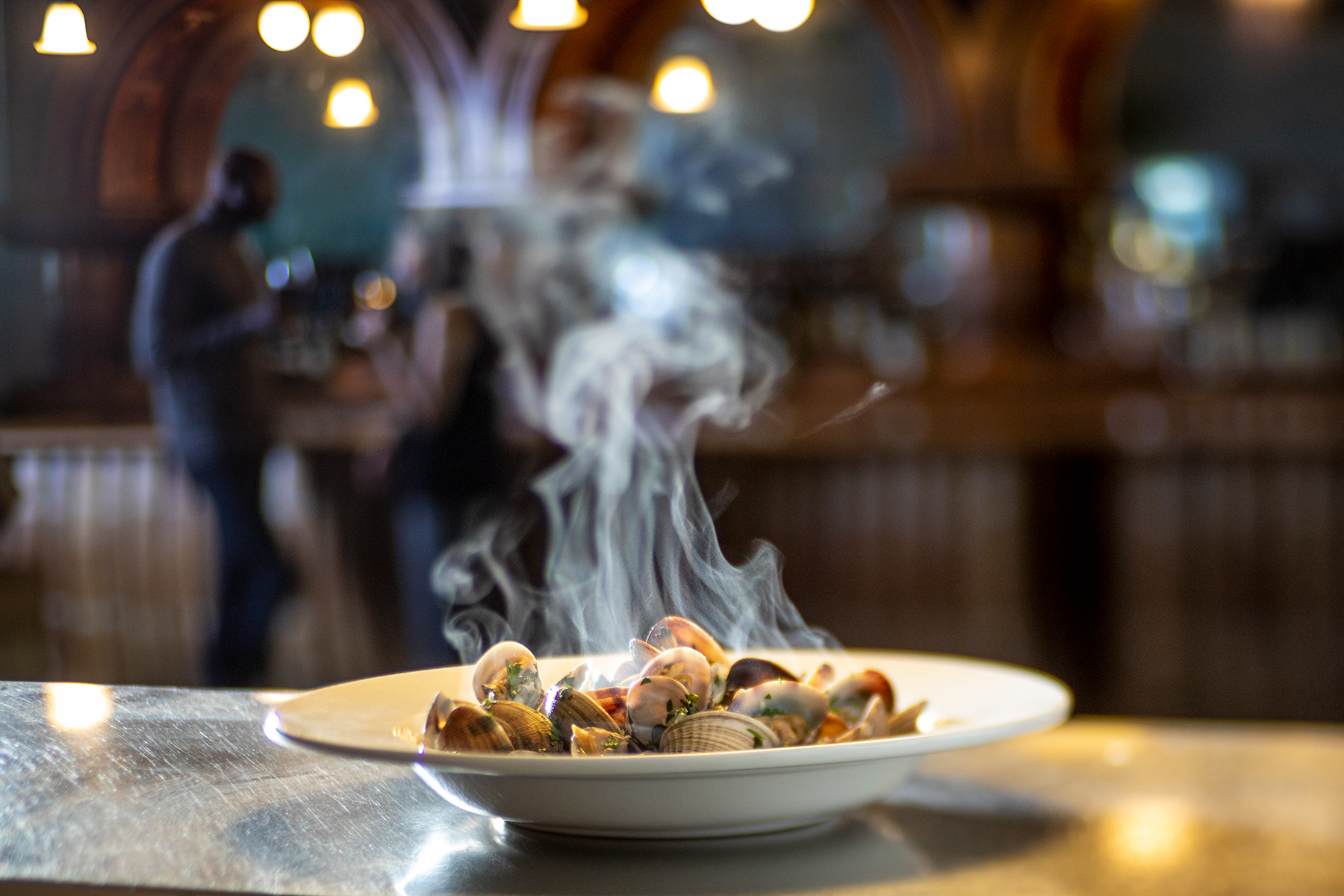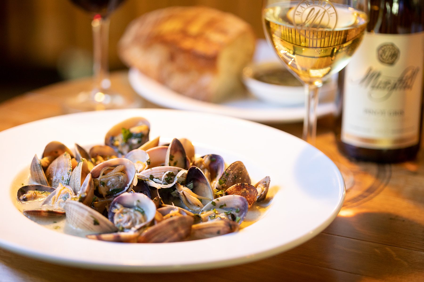 Heat a 10” skillet over medium heat, add olive oil and then clams. Sauté clams gently to heat, about 1-2 minutes. Add shallots and garlic. Keep pan moving over the heat for a minute, then pour in the wine to deglaze the pan. Once the clams open, add butter. Reduce the heat and finish with herbs and chili flakes. Serve with crusty bread.