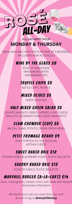 Exclusively at the VANCOUVER Tasting Room & BistroAccess the ROSE ALL-DAY bistro menu with the purchase of a beverage, including non-alcoholic, or featured $8 glasses of Maryhill Rose of Sangiovese, Winemakers White and Winemaker’s Red. Unwind in our inviting and cozy atmosphere on the Vancouver waterfront. Whether you are catching up with friends, enjoying a quiet moment alone, or having a casual business meeting, our Rose All-Day Happy Hour provides the ideal setting with a laid-back vibe to set the stage to sip and savor Maryhill wines along with favorites from the food menu.